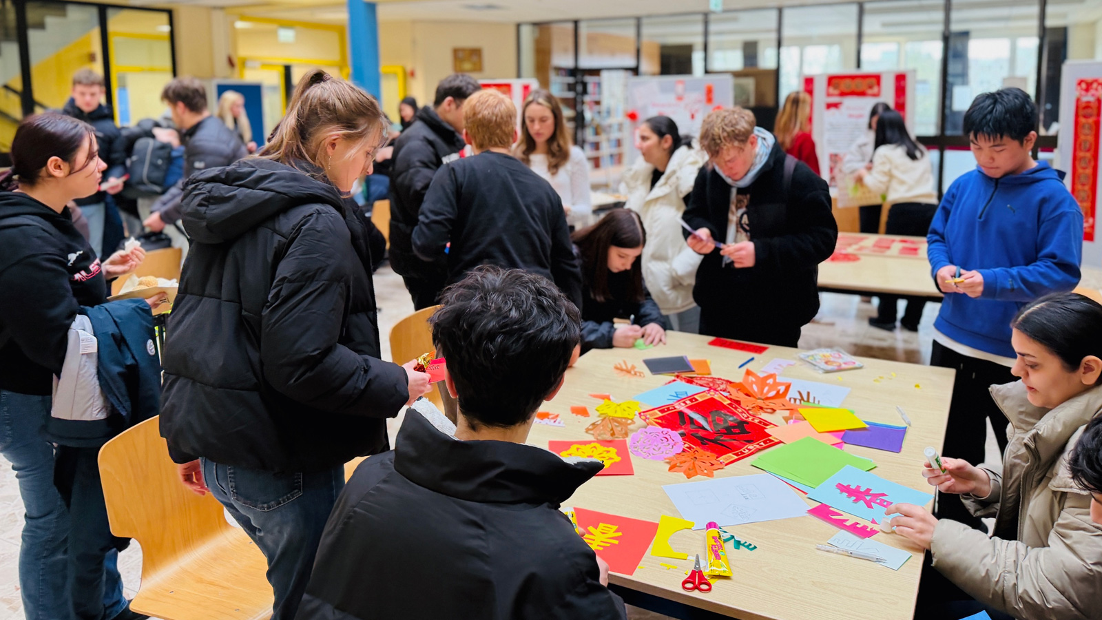 Im Mittelpunkt der diesjährigen Mini-Frühlingsfest-Feier stand die aktive Beteiligung der Gäste. Besucherinnen und Besucher sollten typische Bräuche des Neujahrs selbst ausprobieren und so die traditionelle chinesische Kultur unmittelbar erleben. Die Veranstaltung war in mehrere Aktionsbereiche gegliedert: Ein Wissensquiz, das Anfertigen von Scherenschnitten, das Malen chinesischer Schriftzeichen sowie eine Verkostung mit Süßigkeiten und Gebäck boten vielfältige Einblicke. An jeder Station unterstützten chinesische Schülerinnen und Schüler der BBS 1 die Mitmachaktionen und gaben Anleitung.