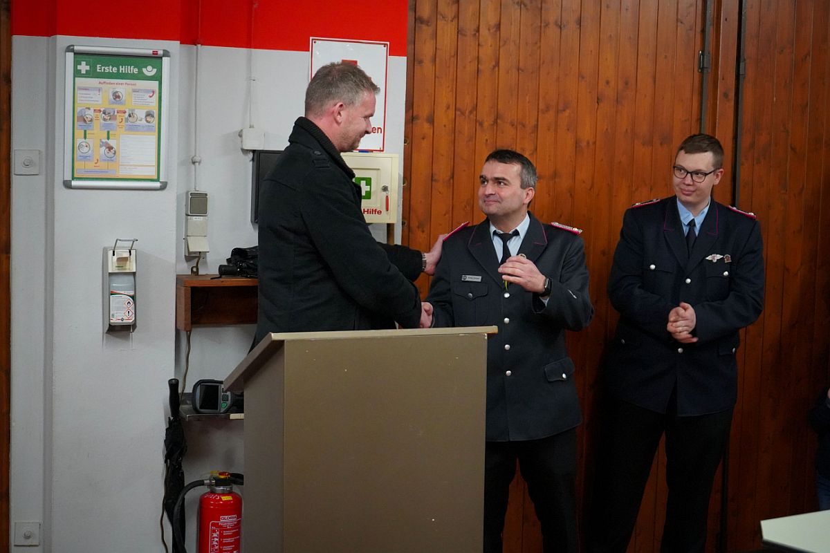 Von Seiten der Feuerwehr richteten Abschnittsleiter Carsten Winkler, stellvertretender Abschnittsleiter Karsten Müller und Gemeindebrandmeister Jan Bialaschewitz Worte an die Versammlung. Karsten Müller überreichte ein kleines Präsent an die Kameraden der Feuerwehr Düderode. Jan Bialaschewitz berichtete von seinen Erinnerungen aus der Jugendfeuerwehrzeit, als das inzwischen alte TSF-W angeschafft wurde. Die damalige Begeisterung für das Fahrzeug und dessen Bedeutung, ließ er in seiner Rede wieder aufleben.