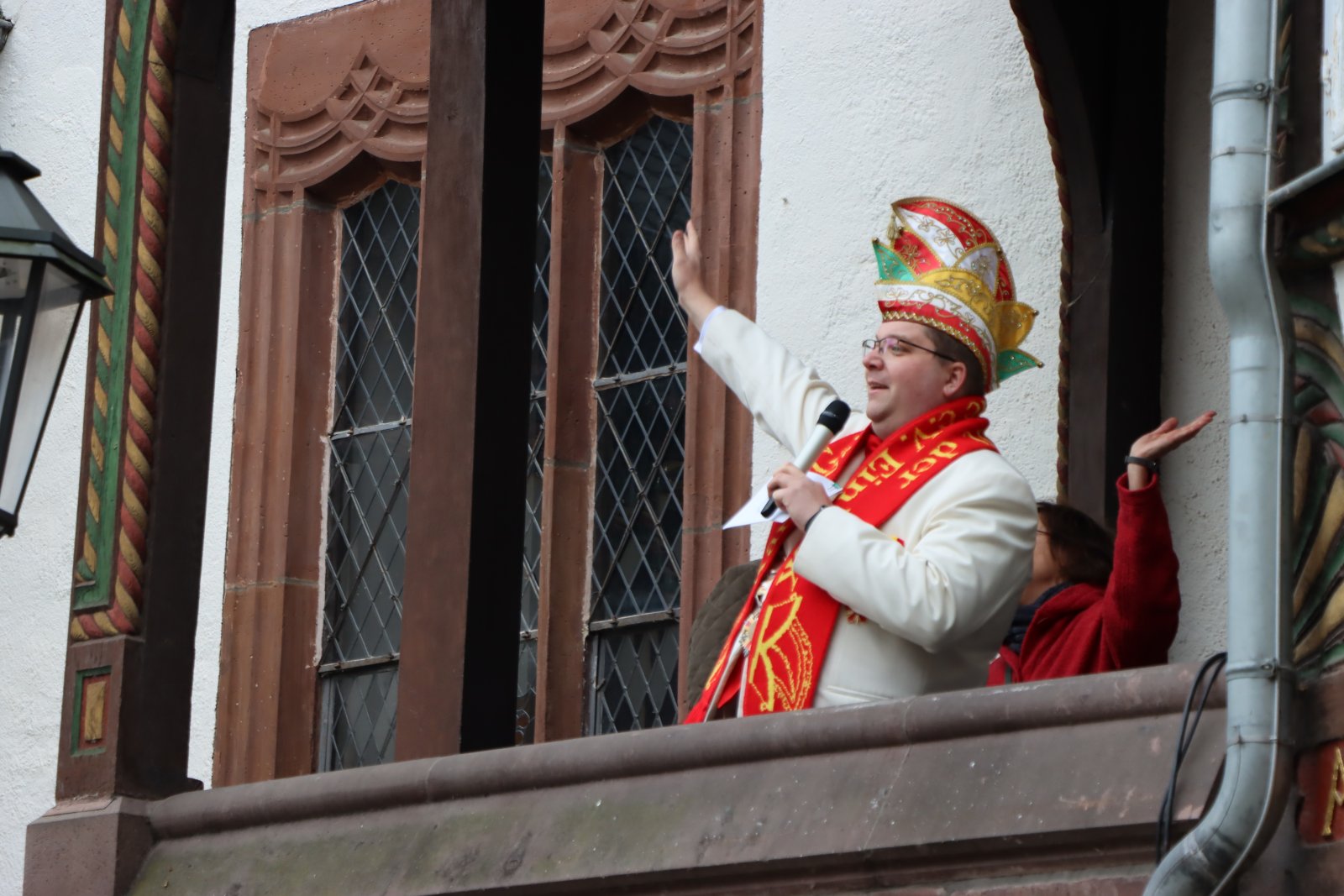 Auf dem Marktplatz angekommen, versammelte sich der Umzug vor dem alten Rathaus, wo feierlich die Schlüsselübergabe stattfand: „Das ist eine lange und bunte Tradition, die mit viel Herzblut, Freunde und Humor gepflegt wird – wir gestalten Momente mit Freude, Geselligkeit und Lachen“, betonte Störmer. Das Kinderprinzenpaar und Prinz Philipp (der 1.) und seine Frau Prinzessin Teresa (die 1.) leisteten volle Überzeugungsarbeit, um den Stadtschlüssel von der Bürgermeisterin überreicht zu bekommen: „Bis Aschermittwoch wollen wir euch aus eurem finsteren Loch herausholen, jetzt sind wir mit regieren dran“, betonte Prinzessin Teresa (die 1.). Bürgermeisterin Michalek konnte nicht lange widerstehen und überreichte schlussendlich den Stadtschlüssel an das Narrenvolk: „Es fehlt oft an Gemeinsinn – wir brauchen das Miteinander, denn nur Hand in Hand profitieren wir voneinander“, gab sie der Narrenschar mit auf den Weg.