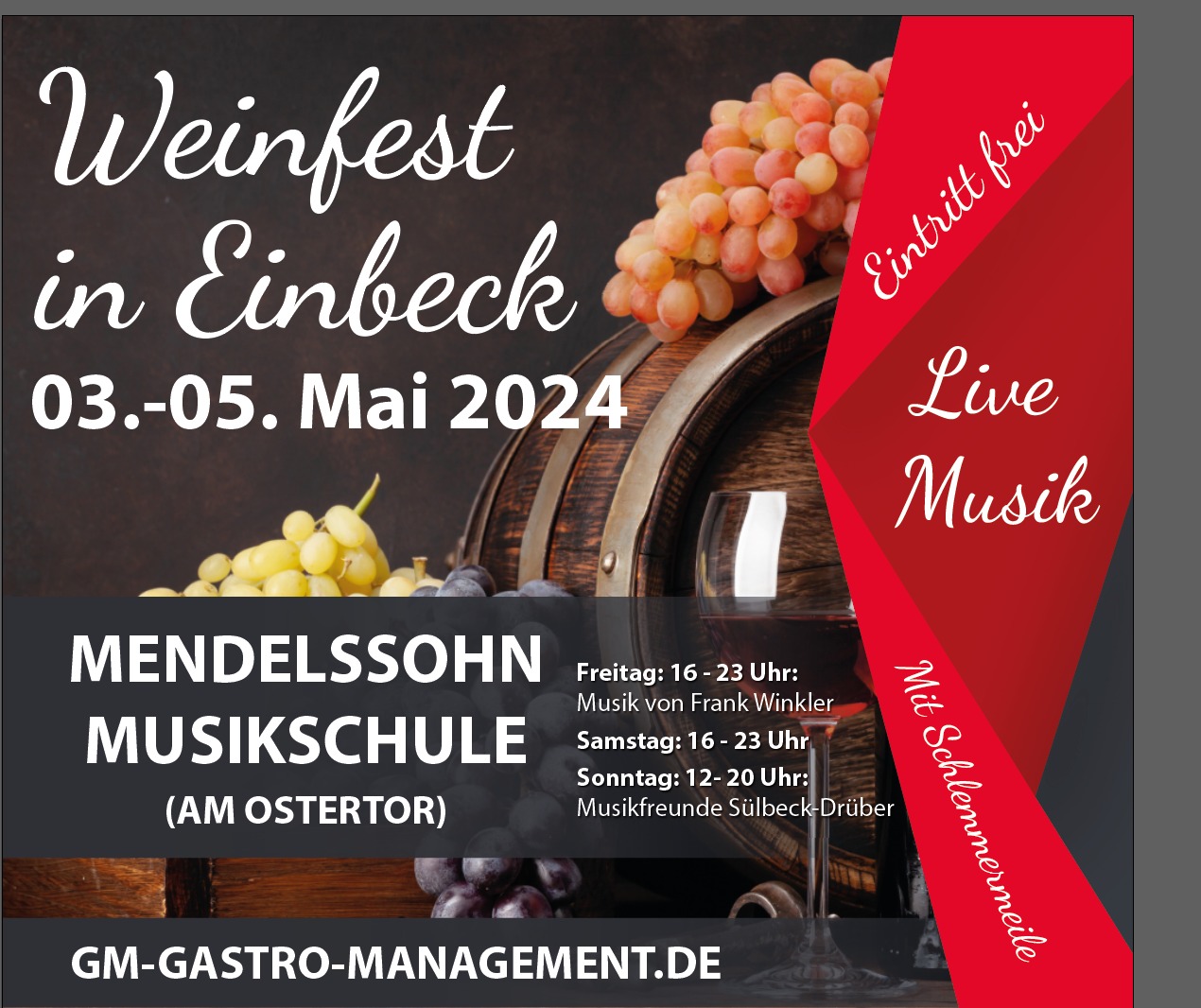 Einbeck. Ob weiß oder rot, trocken oder lieblich: Beim Einbecker Weinfest kommen Weingenießer auf ihre Kosten. Das Gastro Management lädt hierzu am 3. bis 5. Mai zur Mendelssohnschule in Einbeck ein, wo die edelsten Tropen aus der Pfalz, dem Rhein nahe Guldental und Rheinhessen bei Gartenatmosphäre genossen werden können.